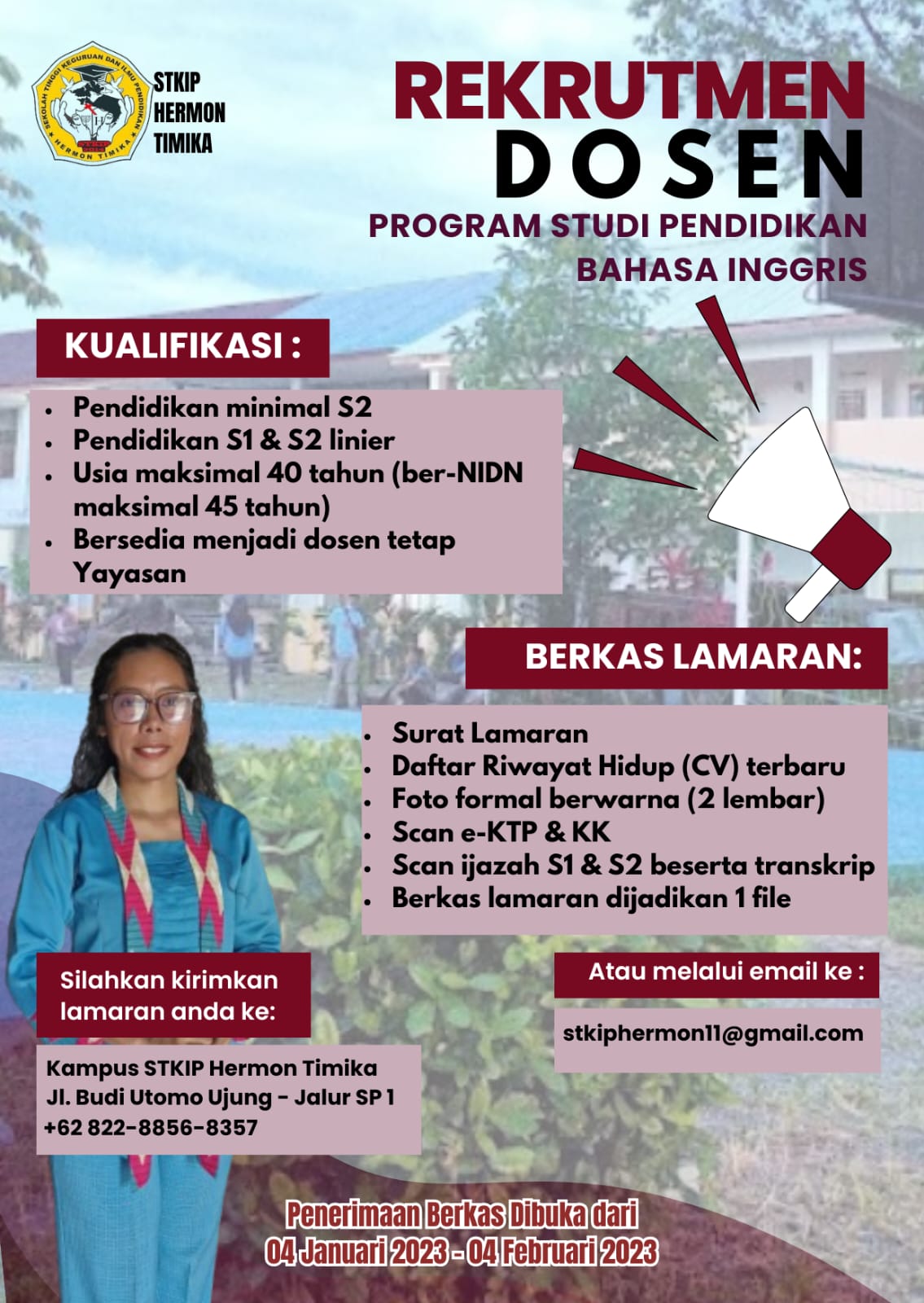 Dalam rangka memenuhi kebutuhan dosen di lingkungan STKIP Hermon umumkan bahwa pada tahun 2023 STKIP Hermon Timika akan melaksanakan   penerimaan calon dosen pada Program Studi Pendidikan Bahasa Inggris. Adapun kualifikasi, berkas dan proses seleksi penerimaan adalah sebagai berikut sebagaiaman di atur dalam Peraturan Ketua Yayasan STKIP Hermon Timika Nomor: 010 Tahun 2014 dan SOP rekrutmen pegawai STKIP Hermon Timika sebagai berikut: