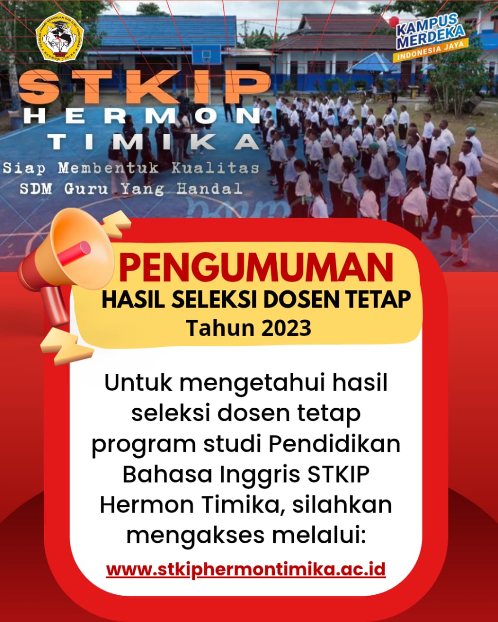 Berdasarkan hasil seleksi administrasi, tes kompetensi, serta wawancara yang telah dilaksanakan oleh Panitia Seleksi Penerimaan Dosen Tetap STKIP Hermon Timika Tahun 2023, dengan ini diumumkan bahwa nama-nama peserta yang dinyatakan LULUS sebagai Dosen Tetap adalah sebagaimana tercantum dalam daftar terlampir (SK Ketua STKIP Hermon Timika)