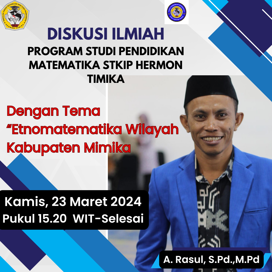TIMIKA – Program Studi Pendidikan Matematika STKIP Hermon Timika menyelenggarakan Diskusi Ilmiah dengan tema “Etnomatematika Wilayah Kabupaten Mimika”. Kegiatan ini menghadirkan A. Rasul, M.Pd. sebagai pembicara utama dan diikuti oleh dosen, mahasiswa, serta alumni Program Studi Pendidikan Matematika STKIP Hermon Timika.
